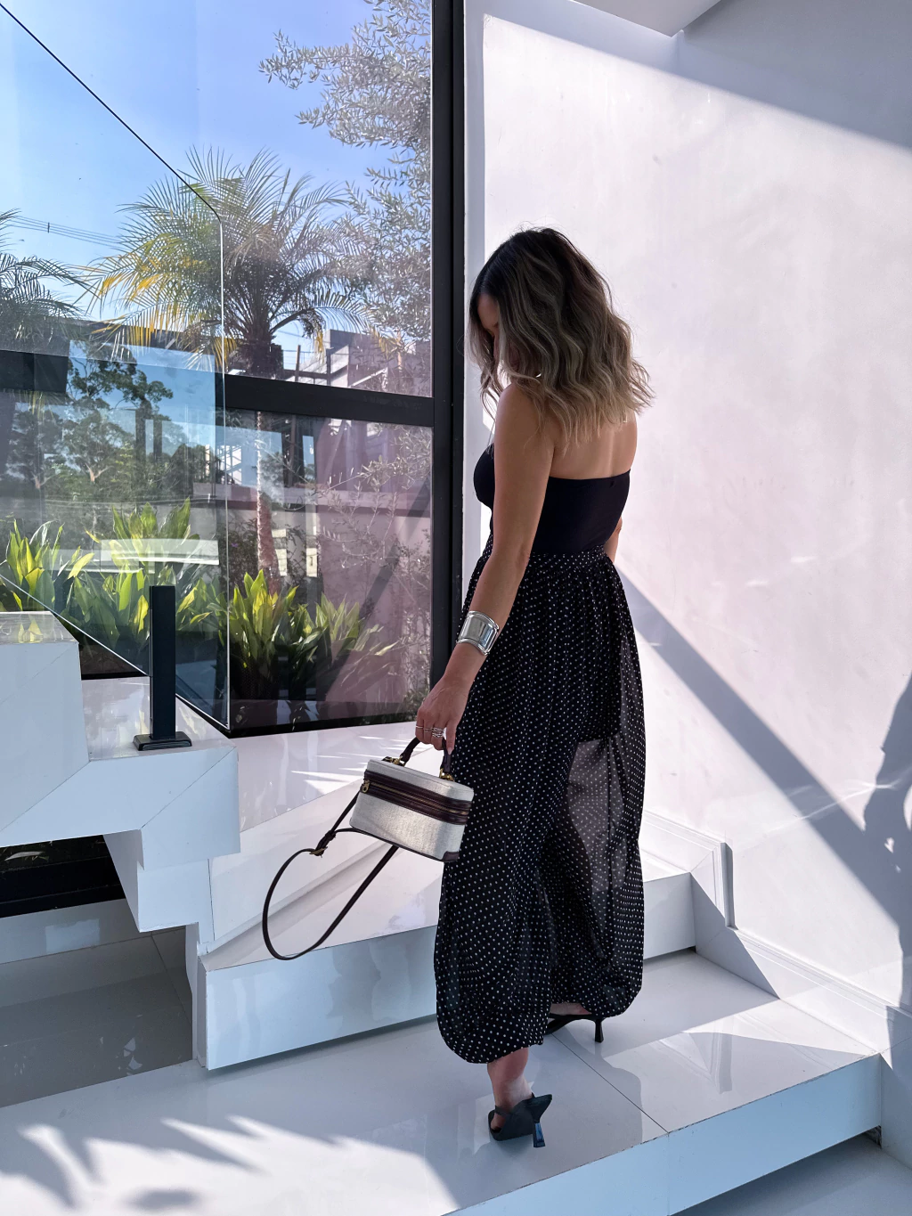 Descrição: Calça aladim com estampa de poá, confeccionada em tecido leve e fluido que proporciona conforto e movimento ao vestir. Possui forro curto, garantindo cobertura sem perder a leveza característica do modelo. O fechamento lateral por zíper assegura um ajuste discreto e perfeito ao corpo. Com seu design soltinho e elegante, é uma peça versátil que une estilo e conforto.